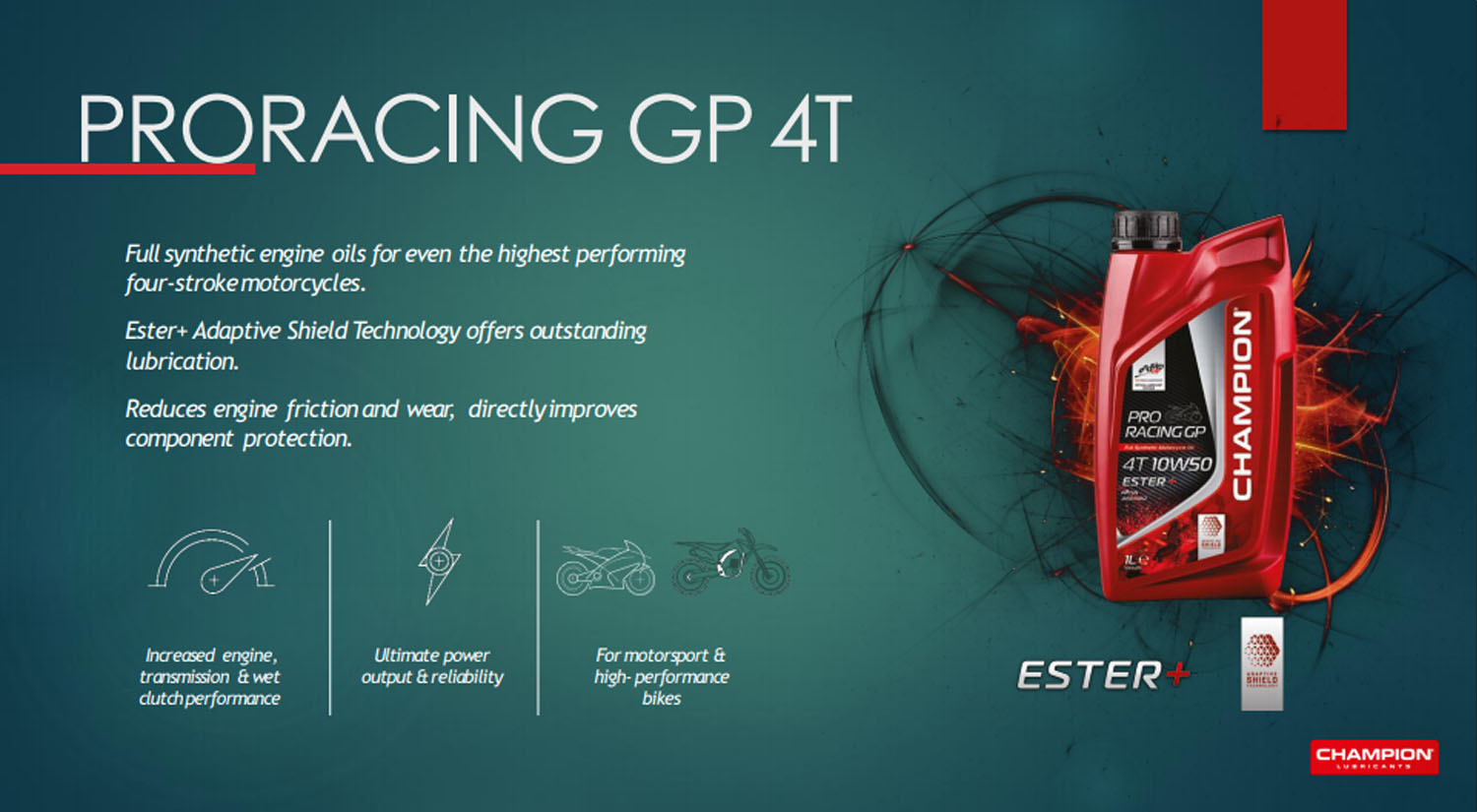 Champion Proracing GPline up of fully synthetic motorcycle engine oil provides unmatched performance capacity with our innovative formulation which ensures even lubrication, improved fuel economy and high durability. Our motorcycle engine oil lubrication provides long lastingness with our Ester+ Adaptive Shield Technology protecting your engine with our superior cleaning, performance enhancement and oxidation protection. Suitable for motorsports and high performance bikes, we do no compromise in terms of performance and ensure maximum horsepower extraction with our lubrication product. Our products include: